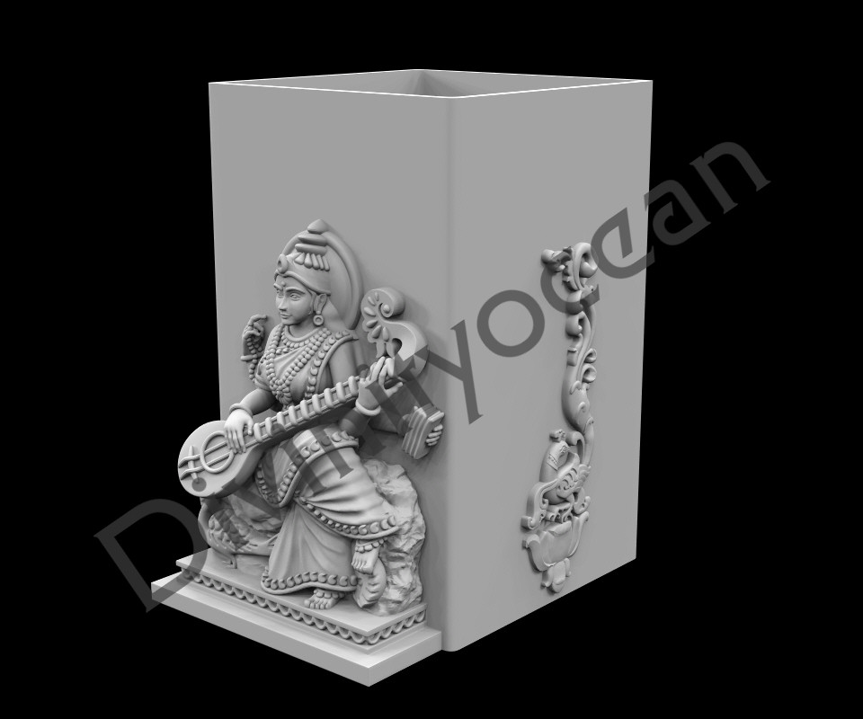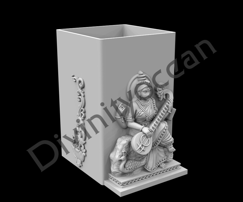 The Saraswati Pen Stand is a beautifully crafted desk accessory that combines elegance and functionality. It features intricate carving of Saraswati, the Hindu goddess of knowledge, music, and arts. The design may includes elements of books, and musical instruments, symbolizing wisdom and creativity. This pen stand not only serves as a practical holder for pens and stationery but also adds a spiritual and artistic touch to any workspace or study area, making it a perfect gift for students, artists, or anyone who values learning and creativity.