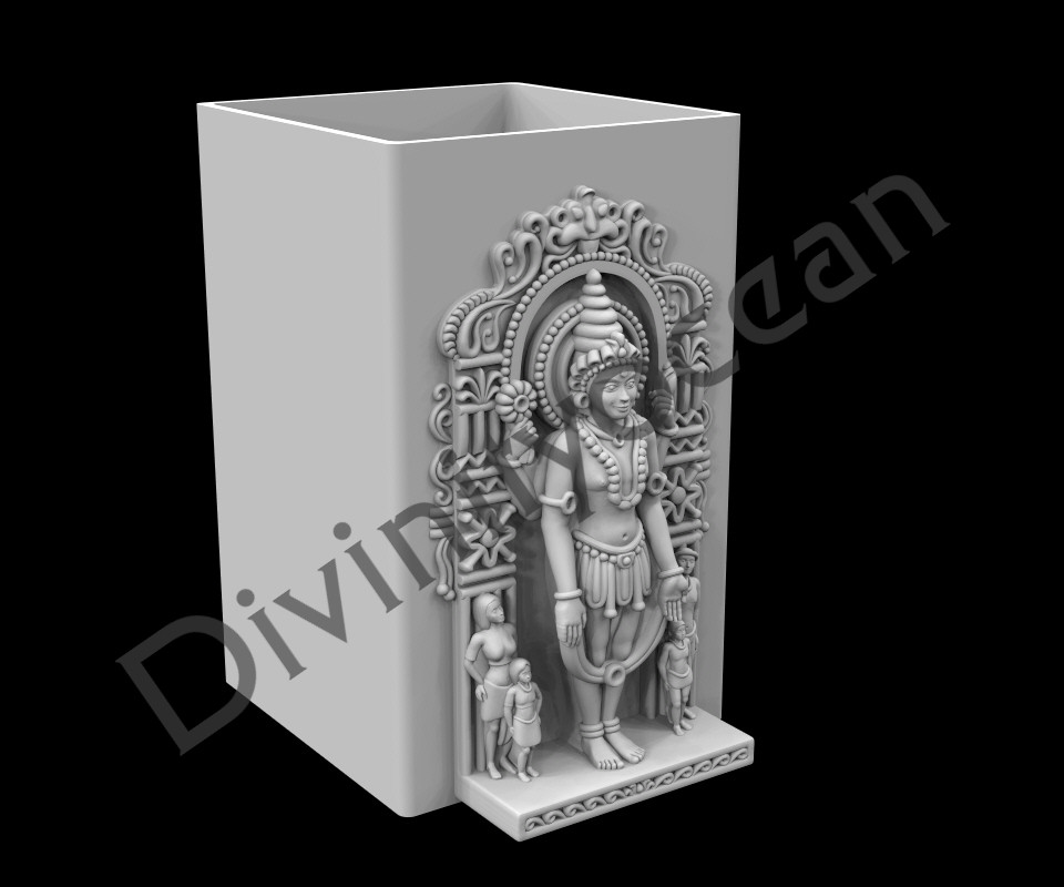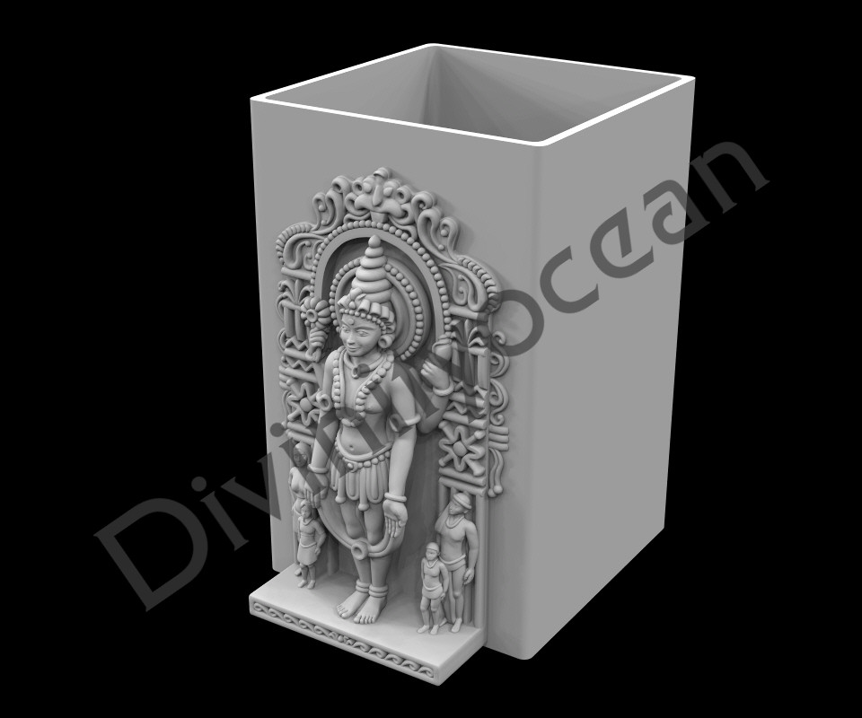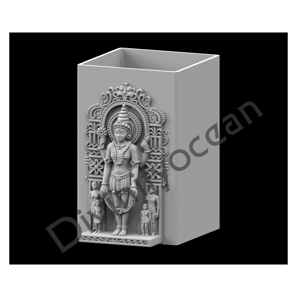 The Standing Vishnu Pen Stand is a beautifully crafted piece that captures the divine essence of Lord Vishnu, one of the principal deities in Hinduism. This intricate stand features Vishnu in a majestic pose, adorned with traditional attire, ornate jewelry, and a serene expression that exudes grace and wisdom. The detailed craftsmanship showcases the intricate designs, making it a perfect blend of art and utility, ideal for devotees and art enthusiasts alike.